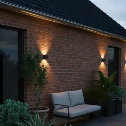 Setzen Sie stilvolle Lichtakzente im Außenbereich mit der D'Lite LED-Wandleuchte Elingen Up & Down – kabellos, wetterfest und elegant.
