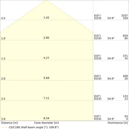 Der Abstrahlwinkel bezeichnet den Winkel, in dem das Licht aus der Lichtquelle ausgestrahlt wird. Er wird in Grad (D) angegeben. Je geringer die Gradzahl des Abstrahlwinkels ist, desto kleiner ist auch der Durchmesser des Lichtkegels, den die Lichtquelle produziert. Beispiel: Wird eine Lampe mit einem Abstrahlwinkel von 60 Grad an der Decke (2,5 m Höhe) angebracht, erzeugt sie einen Lichtkegel von 2,9 Metern Durchmesser. Hat die Lampe hingegen einen Abstrahlwinkel von 120 Grad, beträgt der Lichtkegel 8,7 Meter im Durchmesser. |