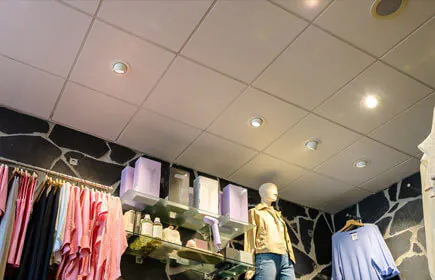 - Im Geschäft wurden nur Leuchten mit weißer Lichtfarbe verwendet, die eine ruhige Decke schaffen. Dadurch wird sichergestellt, dass die Besucher das Sortiment sofort im Blick haben (keine Ablenkung).